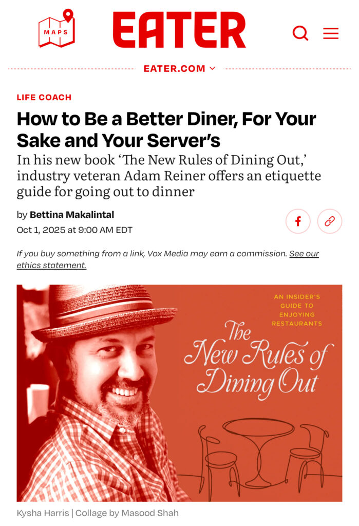 “In a perfect world, everyone would absorb Reiner’s spot-on etiquette guidelines, and the experience of dining out would improve for everyone involved — servers, chefs, and customers alike. Pro tip: politeness pays off.”